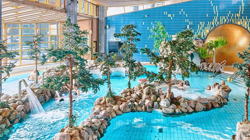 Kylpylän 16 allasta takaavat vivahteikkaan ja monipuolisen virkistysvesipäivän. 80 metrin vesiliukumäki ottaa aikaa nopeudestasi, ja erilaiset saunat tuovat lämpöä syksyn viileyden vastapainoksi. Lisäksi altailla voit harrastaa Hydrohex-virtuaalivesijumppaa oman aikataulusi mukaan – valitse ohjelma ja sukella vesiliikunnan maailmaan silloin, kun sinulle parhaiten sopii. Rannekkeella pääset kylpylään ja takaisin niin usein kuin haluat klo 8 ja 21 välillä.